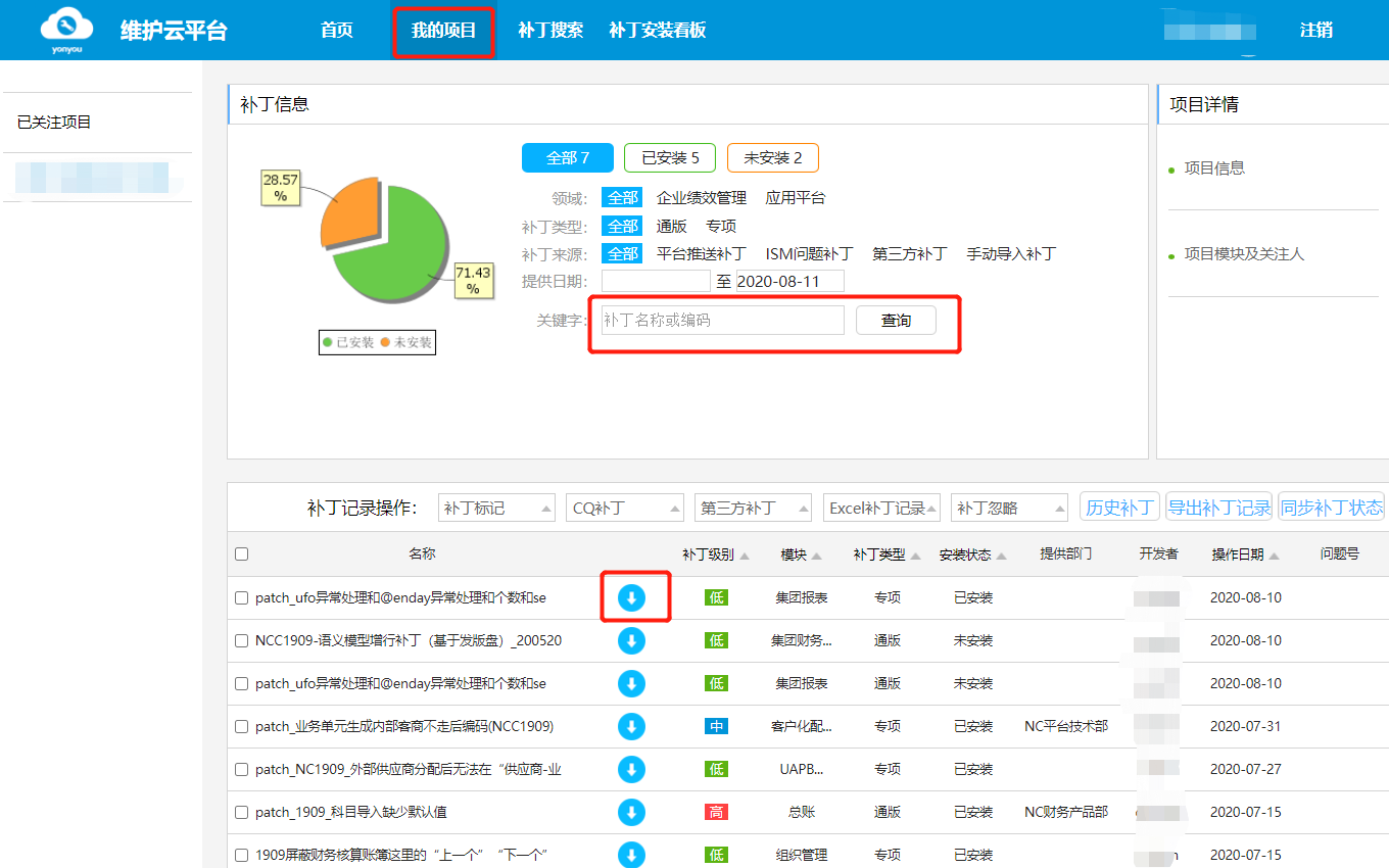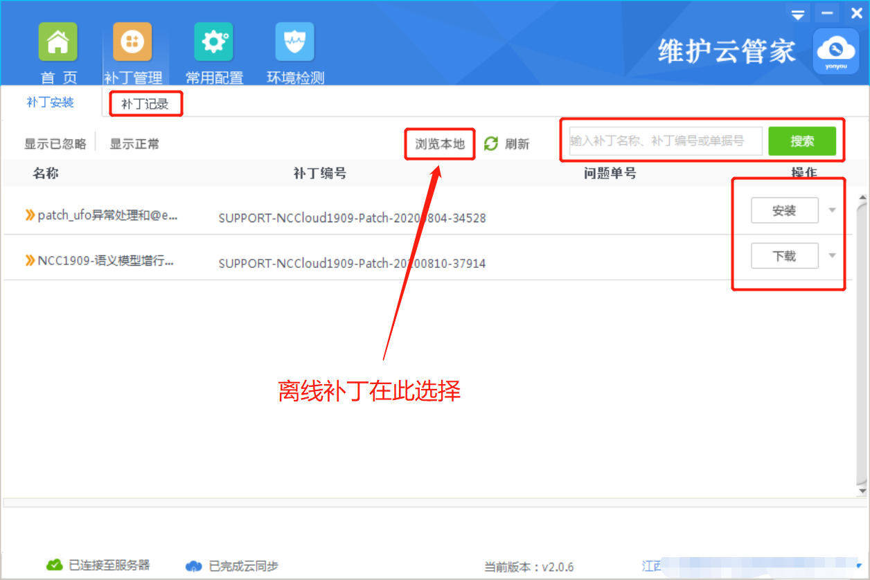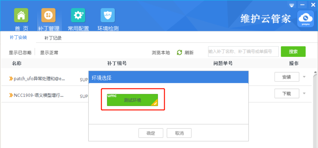2、如果客户是内外网隔离的情况。请使用服务识别码和密码,登录NC维护云平台http://umc.yonyou.com,在我的项目中找到补丁进行下载。然后拷贝到云管家客户端所在机器,使用NC维护云管家“浏览本地”选择下载的补丁进行安装。